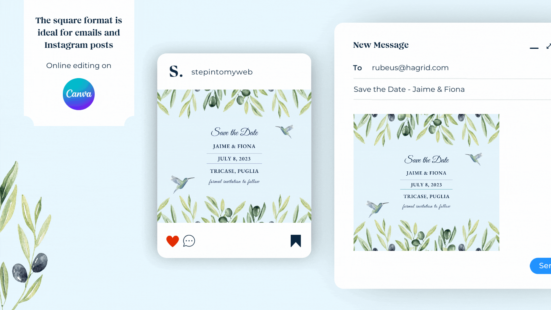 You will receive a Canva template link which will give you access to the save the date in two different formats (mobile and square)